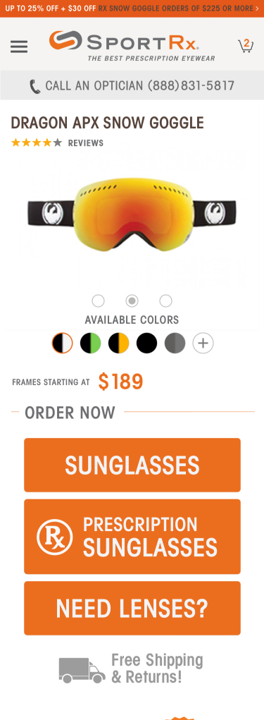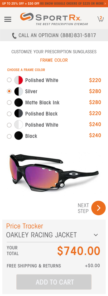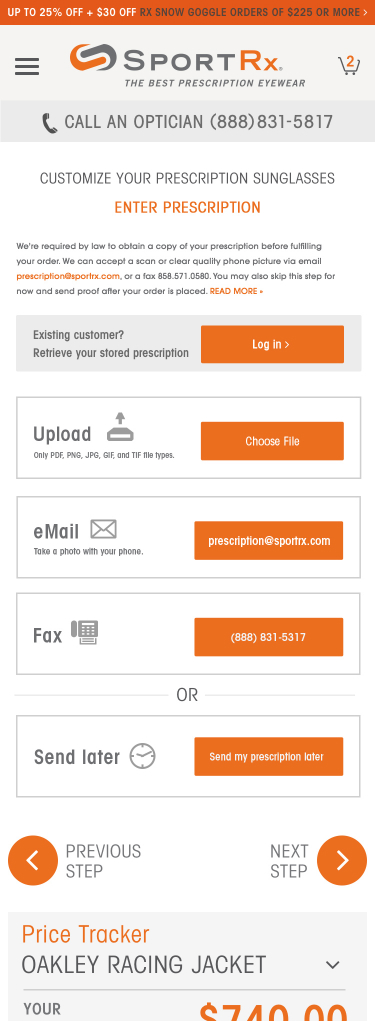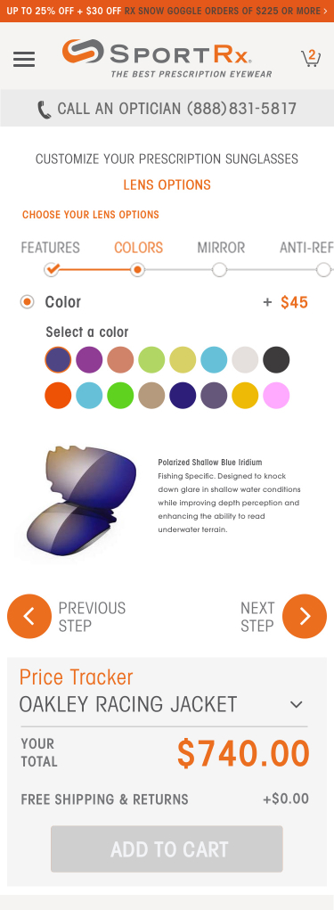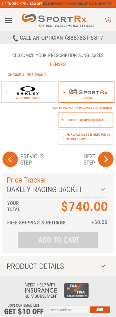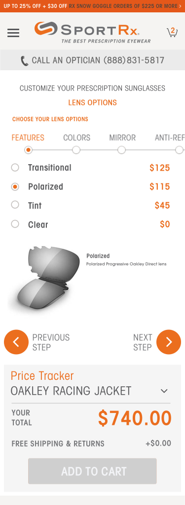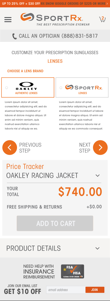 A key stand-out feature of the SportRx site, is the ability for a user to do advanced customization on their eye-wear, entirely online. We worked closely with the SportRx team to develop a sophisticated product flow complete with feature blocking based on brand, prescription, and design preference.